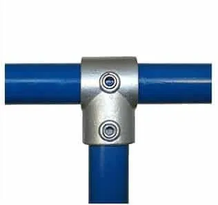 Often used to join intermediate uprights to top rails and middle rails to end uprights on level sites. This cannot be used where through tube (horizontal in photo) has to be joined within the fitting.