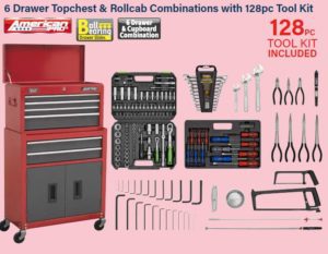 Product Description: 6 Drawer Topchest & Rollcab Combination with Ball-Bearing Slides & 128pc Tool Kit