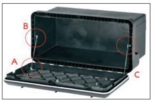 • Plastic material with high resistance to: flammability, water and dust ingress, fuel and lubricating oil, UV rays, high and low temperatures