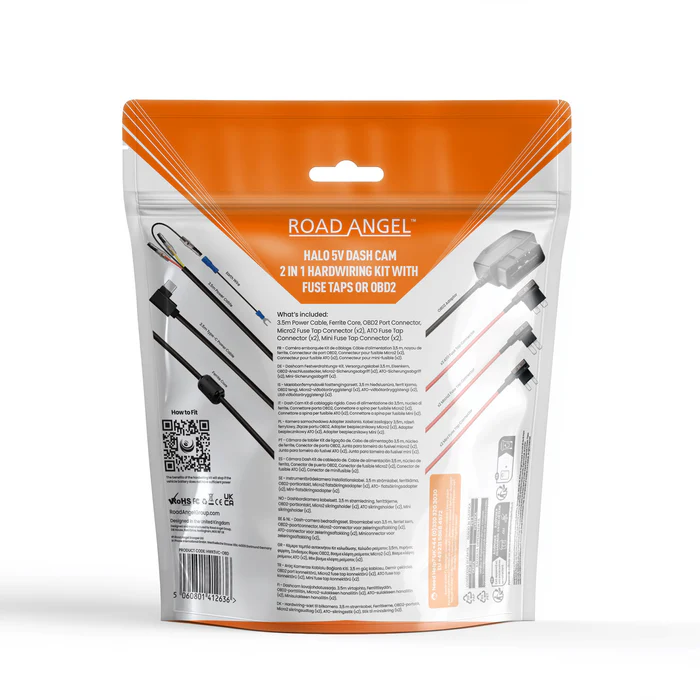 - Simple Installation: Connect one end of the cable to your vehicle’s fuse box; the other end plugs directly into the Road Angel Halo dash cam.