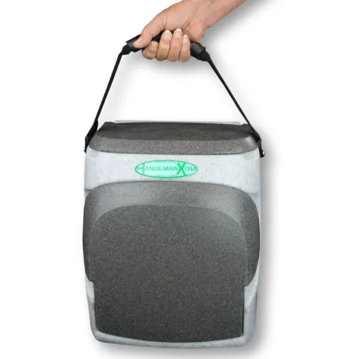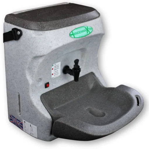The Handeman Xtra for mains supply provides a minimum of fifteen 12 second hand washes per filling – enough for hard day’s work. It provides hot water with fingertip tap operation. It has a unique jet spray that reaches every part of the hands and washing under running water means there’s no need to dip hands into dirty suds.