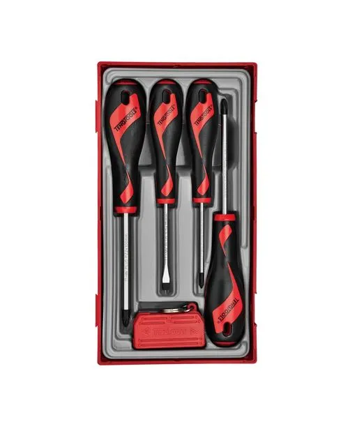 TengTools TT905N screwdriver set is manufactured according to DIN standards and designed for daily professional use. It includes four commonly used screwdrivers and a magnetizer, which allows the tip of the screwdriver to be magnetized or demagnetized. The set contains the MD922N, a 1.0 x 5.5 mm slotted screwdriver with a small handle and a 75 mm long blade. The range of PH screwdrivers includes the MD947N1 PH1 x 75 mm with a medium handle and the MD948N1 PH2 x 100 mm with a large handle. Also included is the MD962N PZ2 x 100 mm with a large handle. The two-component handles are ergonomically shaped for both power and speed. Durable, easy-to-read markings on the handle, positioned to remain visible during use, indicate the tool’s item number, tip type, and size. A hanging hole in the handle serves as an attachment point, allowing individual tools to be stored hanging or used as a T-handle. Each screwdriver in the set is made of TT-MV PLUS steel alloy, a material with high strength and resistance to wear and deformation. The round blades feature protruding “wings” that prevent them from rotating inside the handle. The set is organized in a size 1 tool module (TT1), designed for integration with the TengTools Tool Control System.