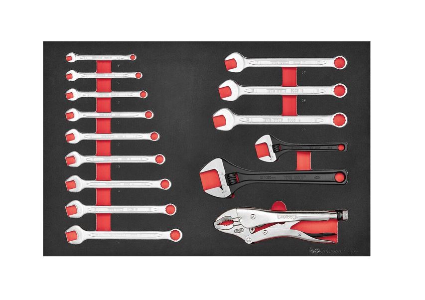 TengTools TTESP15 set includes 15 professional-grade spanners and pliers, combining metric combination spanners, adjustable spanners, and a power grip plier. The set features 12-point ring and open-ended spanners ranging from 8 mm to 19 mm, with the same size opening at both ends. The 15° offset design improves access on flat surfaces, while the TengTools ‘Hip Grip’ design engages the flat sides of fastenings to reduce slippage and wear. Manufactured from chrome vanadium steel with a satin finish, the spanners provide high durability and corrosion resistance, meeting DIN 3113A standards. Also included are two adjustable spanners (150 mm and 250 mm) for use with various bolt and nut sizes, along with a 235 mm curved jaw power grip plier for secure gripping and clamping. All tools meet DIN and ISO standards and the set weighs 2.34 kg in total. The tools are held in place using three colour precision cut high-density EVA foam. The set is organised in a tool module size 4X4 (FOAM4X4), compatible with the TengTools Tool Control System.