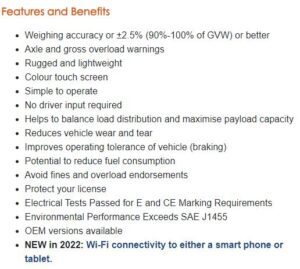 Axle Load Monitoring: The VanWeigh® axle overload monitoring system is specifically designed for two axled vehicles with standard coil or leaf spring suspension and/ or air suspension.